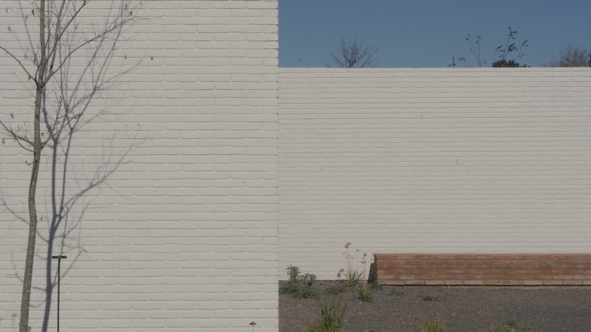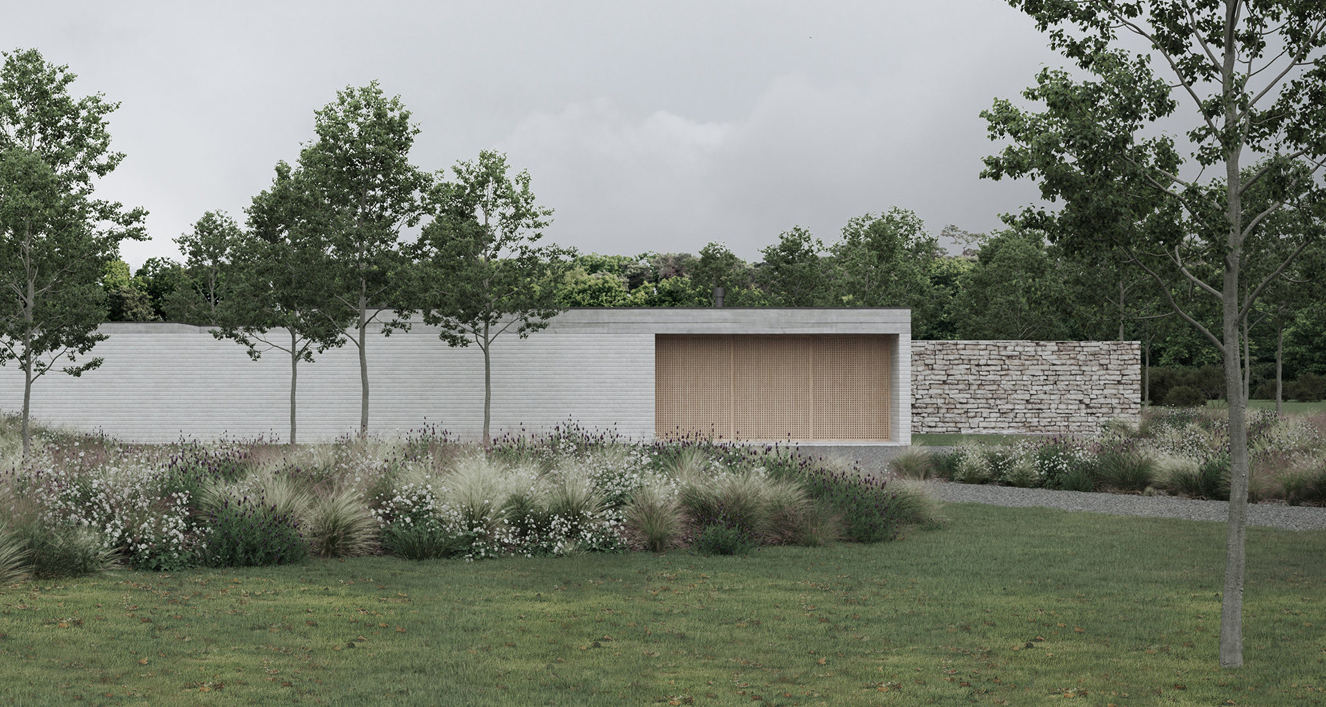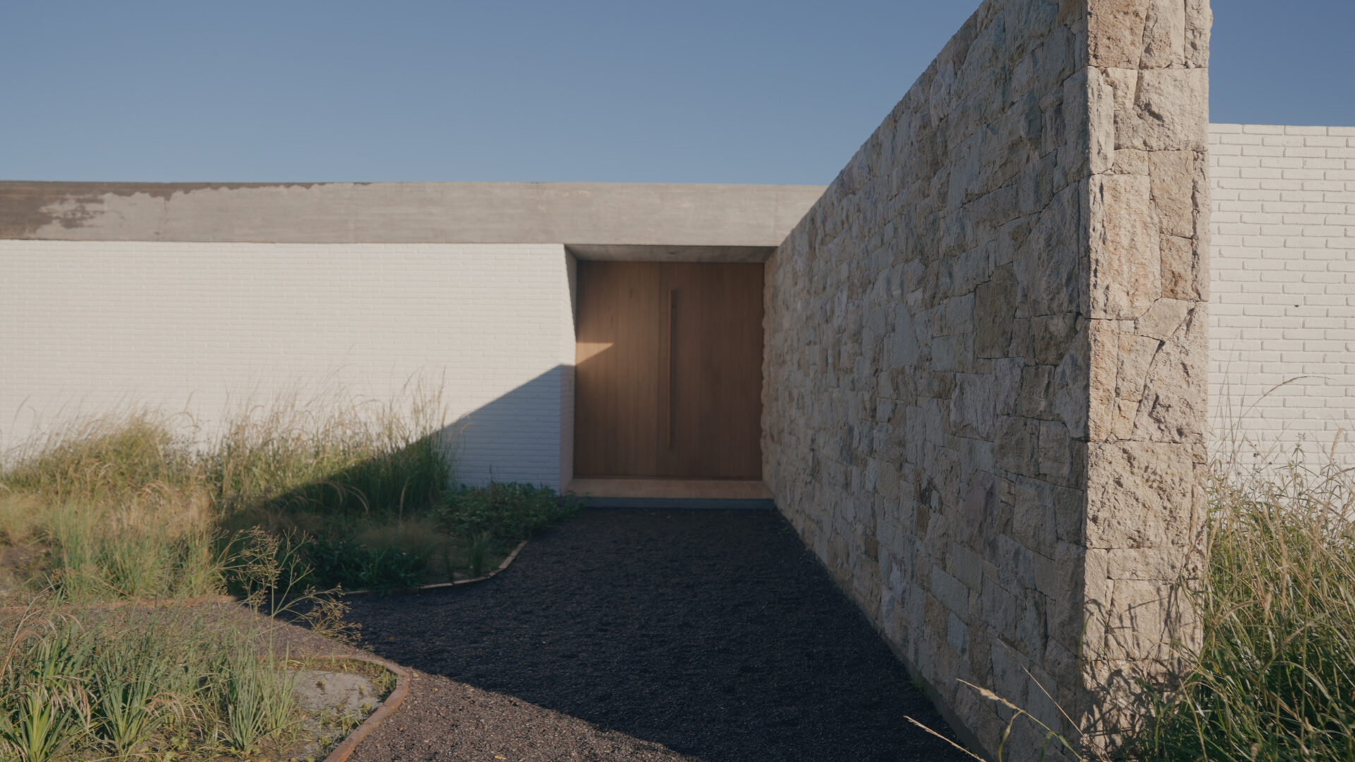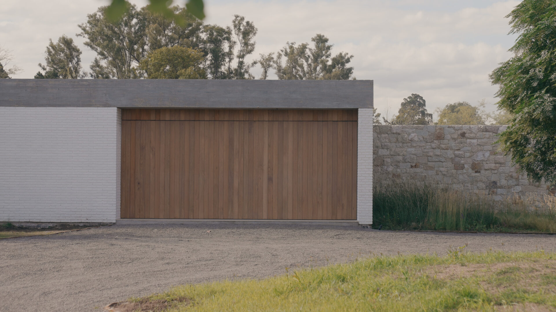 From the outside, the volume is essentially blind, as it denies a direct opening on its south-facing main façade. An automatic wooden gate hides the sector to store two vehicles, in composition with a white brick wall that is blurred thanks to the low and undulating vegetation.
