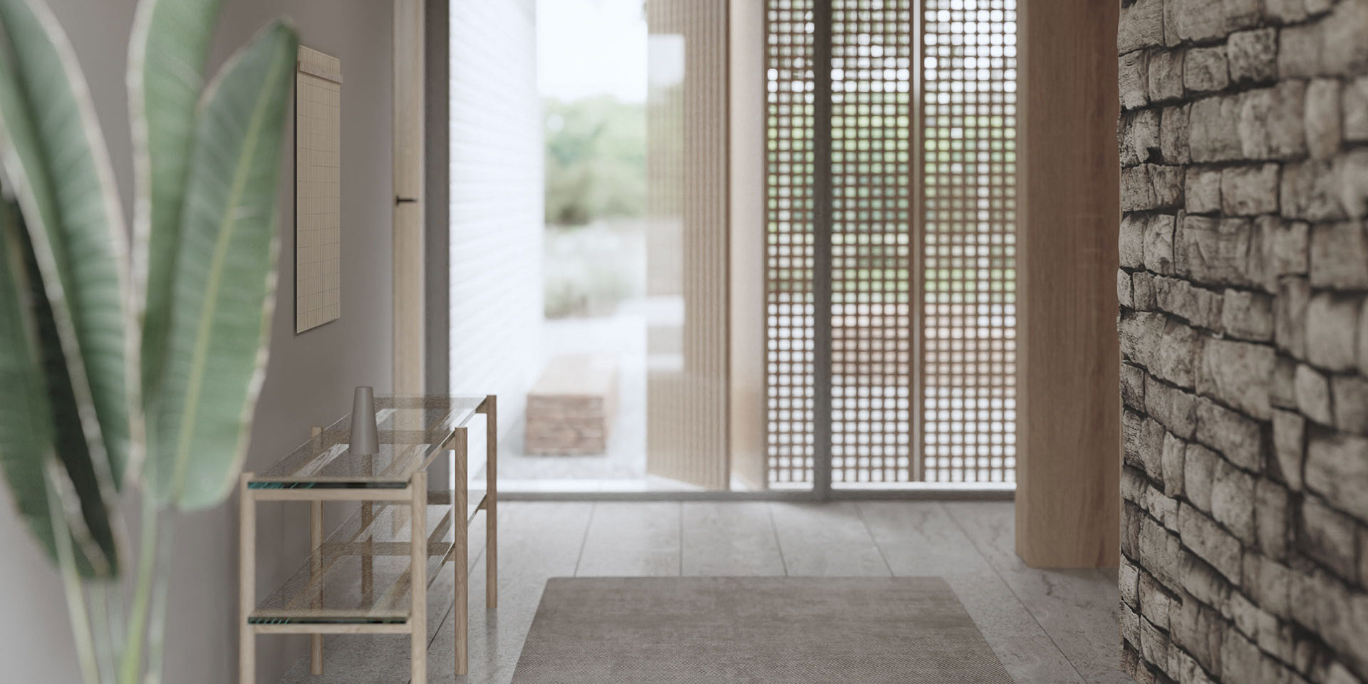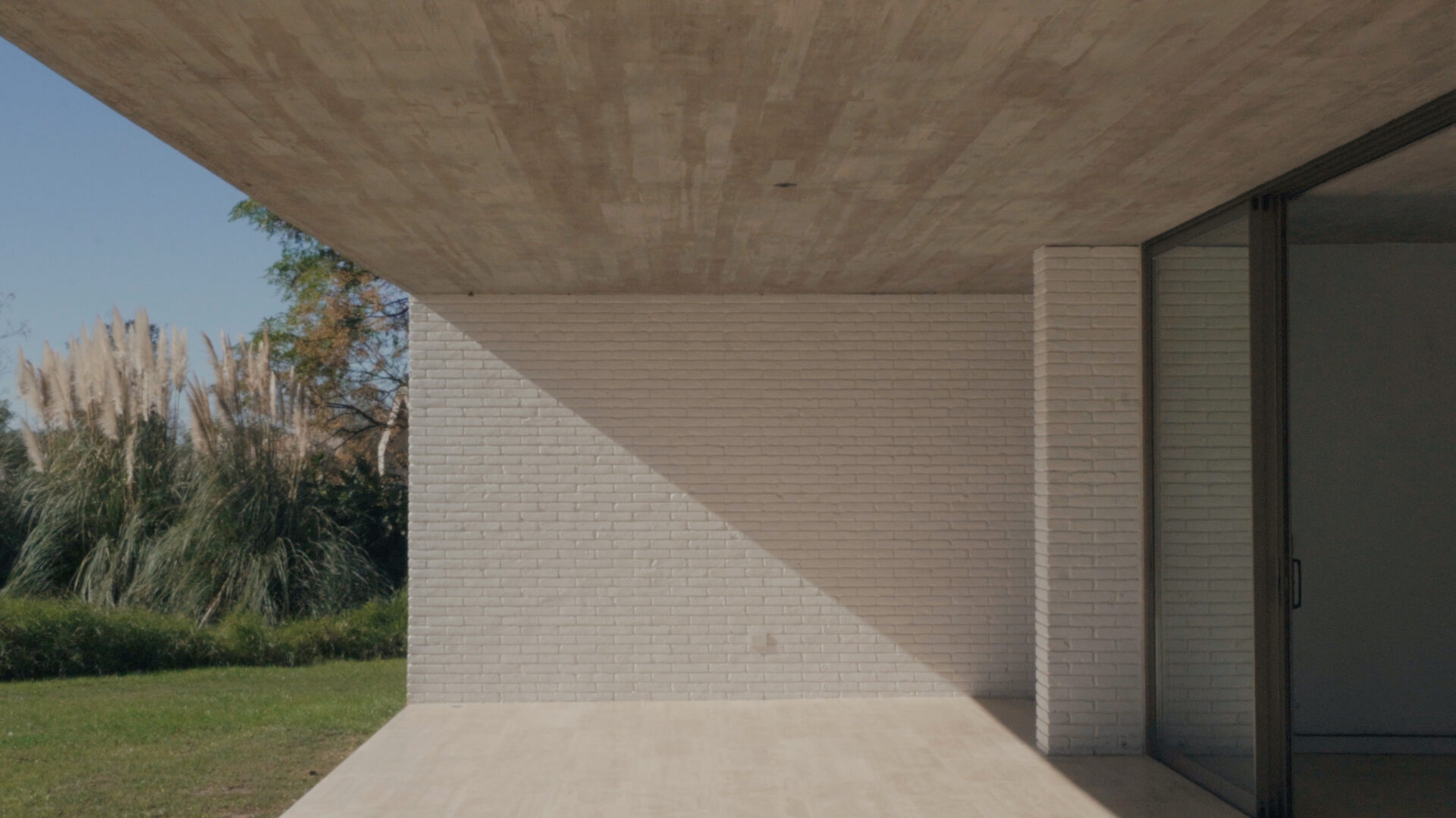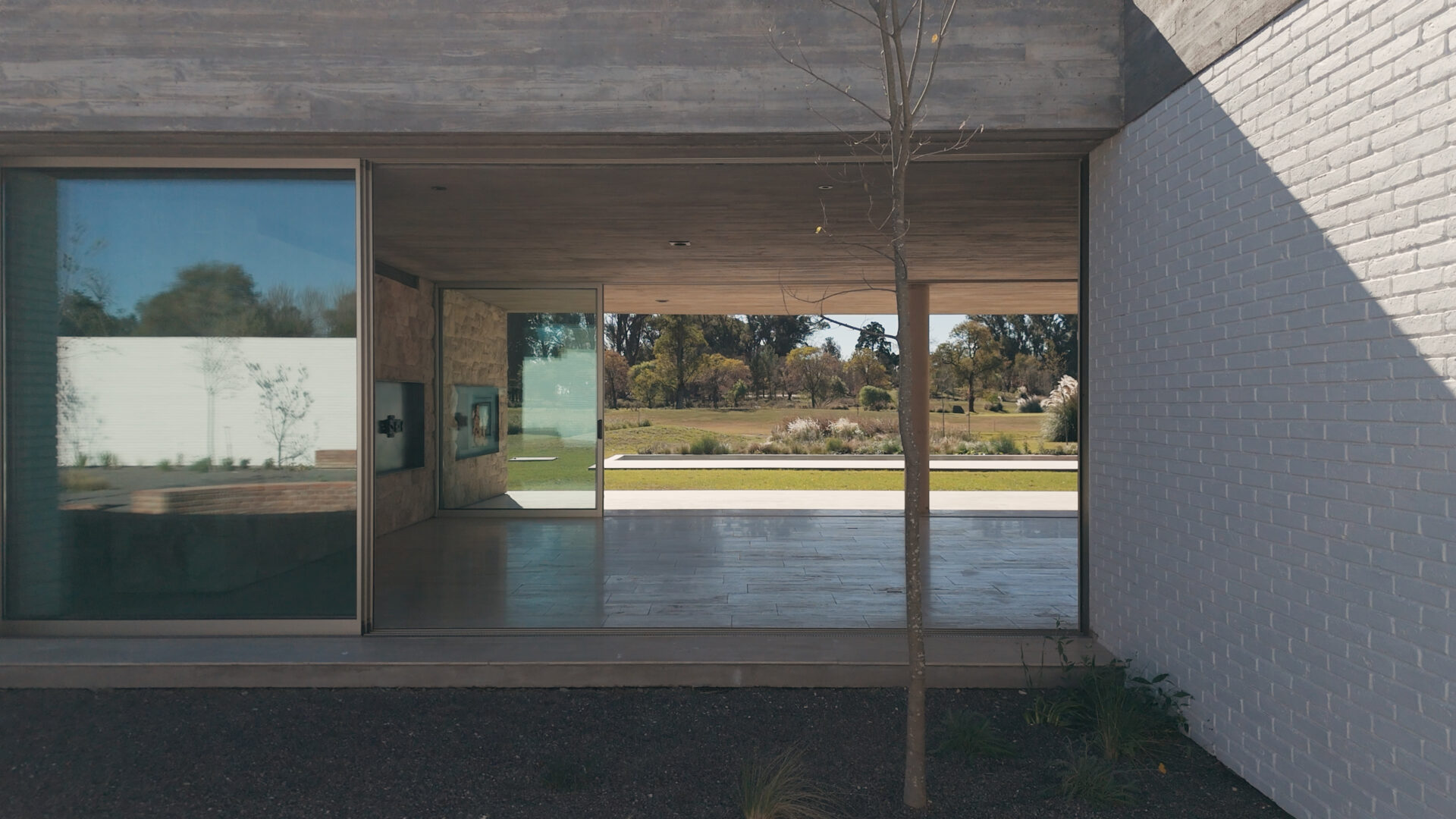 One of the sides connects the access to the house. Through the reception hall, the internal patio is discovered.. a green place of shelter within the breadth of its implantation. The hall hierarchizes the entrance and, together with the patio, structures the internal route towards the main sectors.