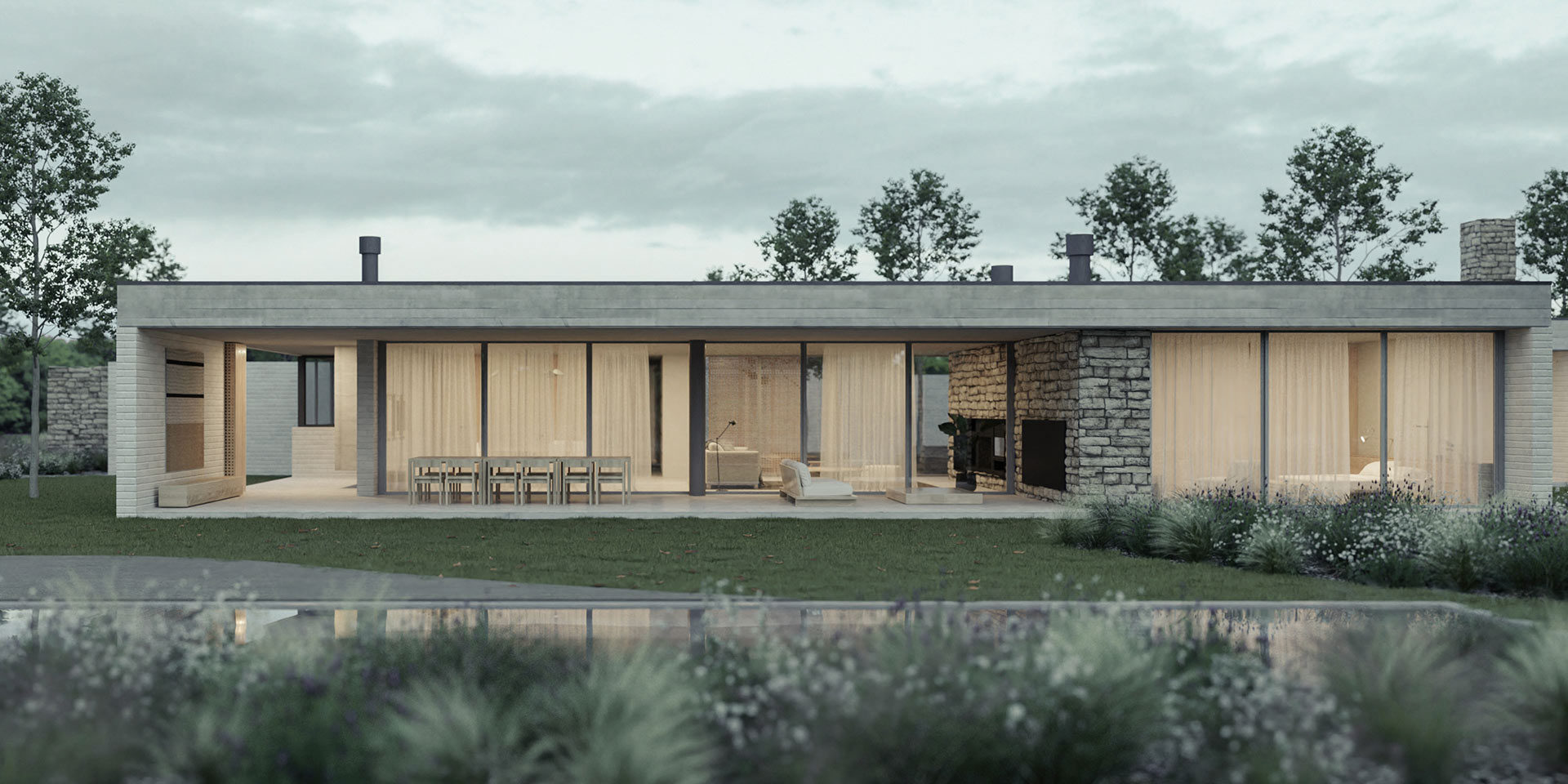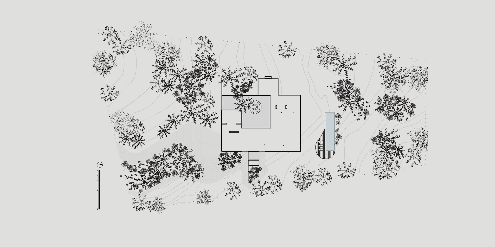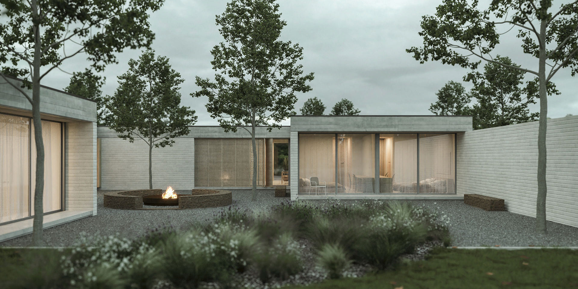 In addition to acting as a void, the patio proposes a natural scenery that replicates the same landscaping logic as in the rest of the lot. In this space contained and protected from the sun, an ideal microclimate arises for social gatherings around a fire.