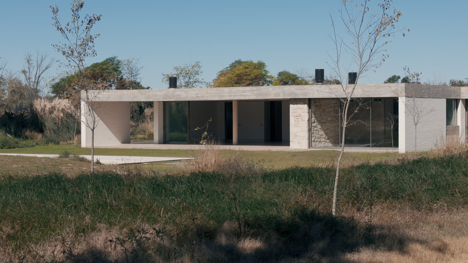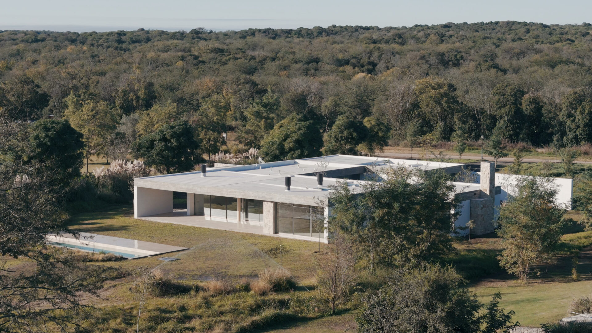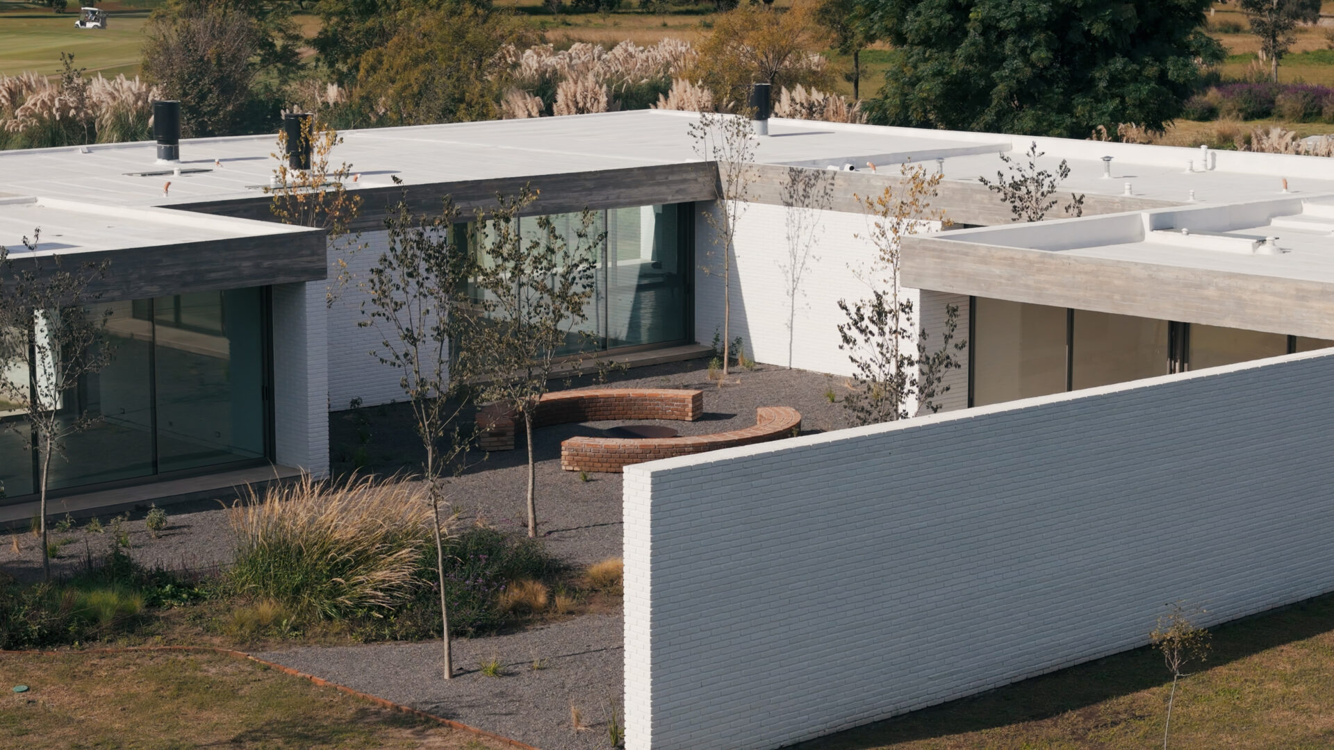 The service area consists of a laundry room, a room with a bathroom, a clothes rack and storage space.Exposed concrete ceilings shape elegant spaces finished with white brick. Travertine floors are arranged between the fire (with the presence of stokers and fireplaces) on Ascochinga stone walls next to the landscaping inspired by the hills of the golf course. Thus, the subtle relationship between various green areas and private areas, distinguishes the project and gives it a refined character.
