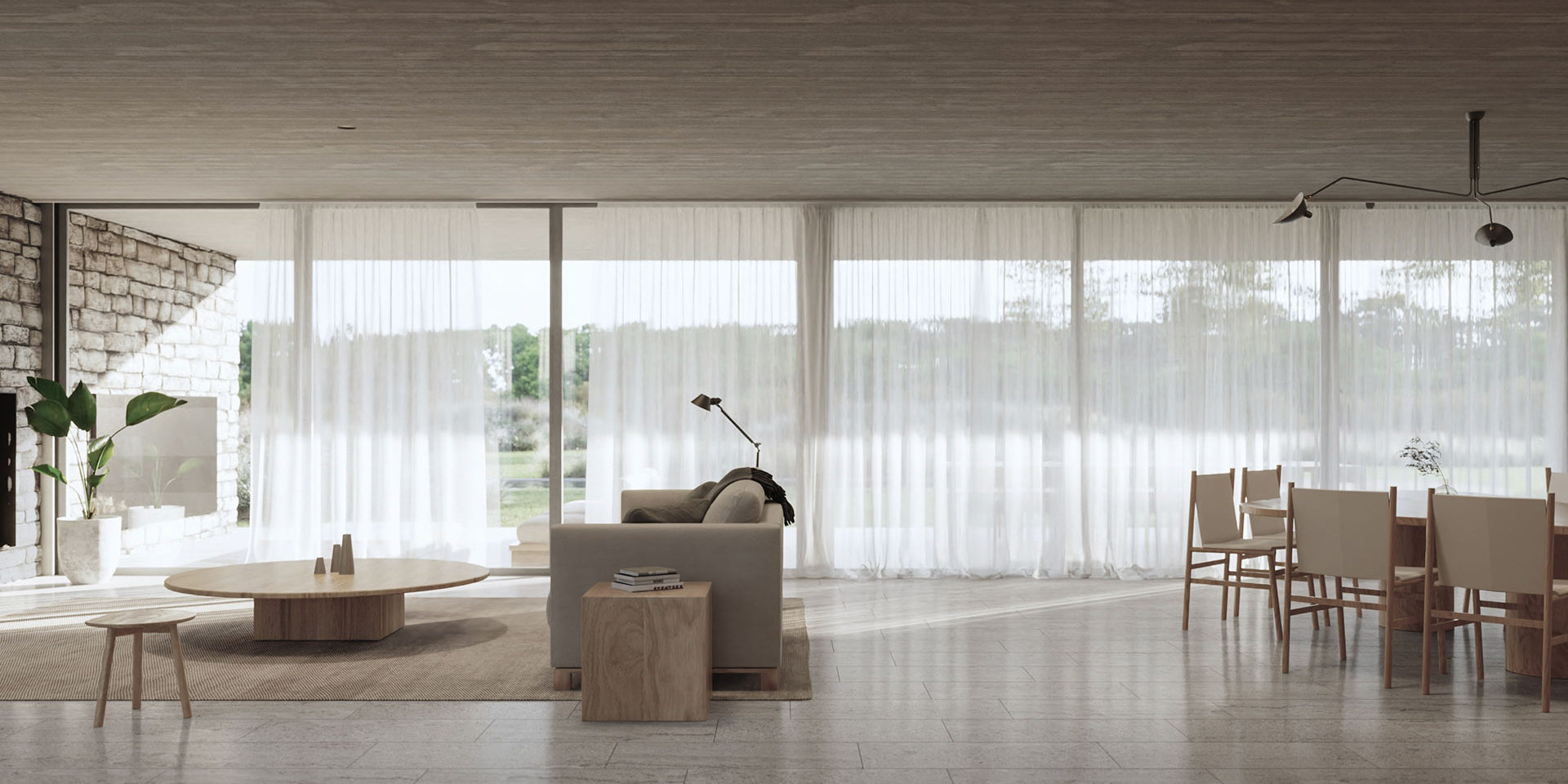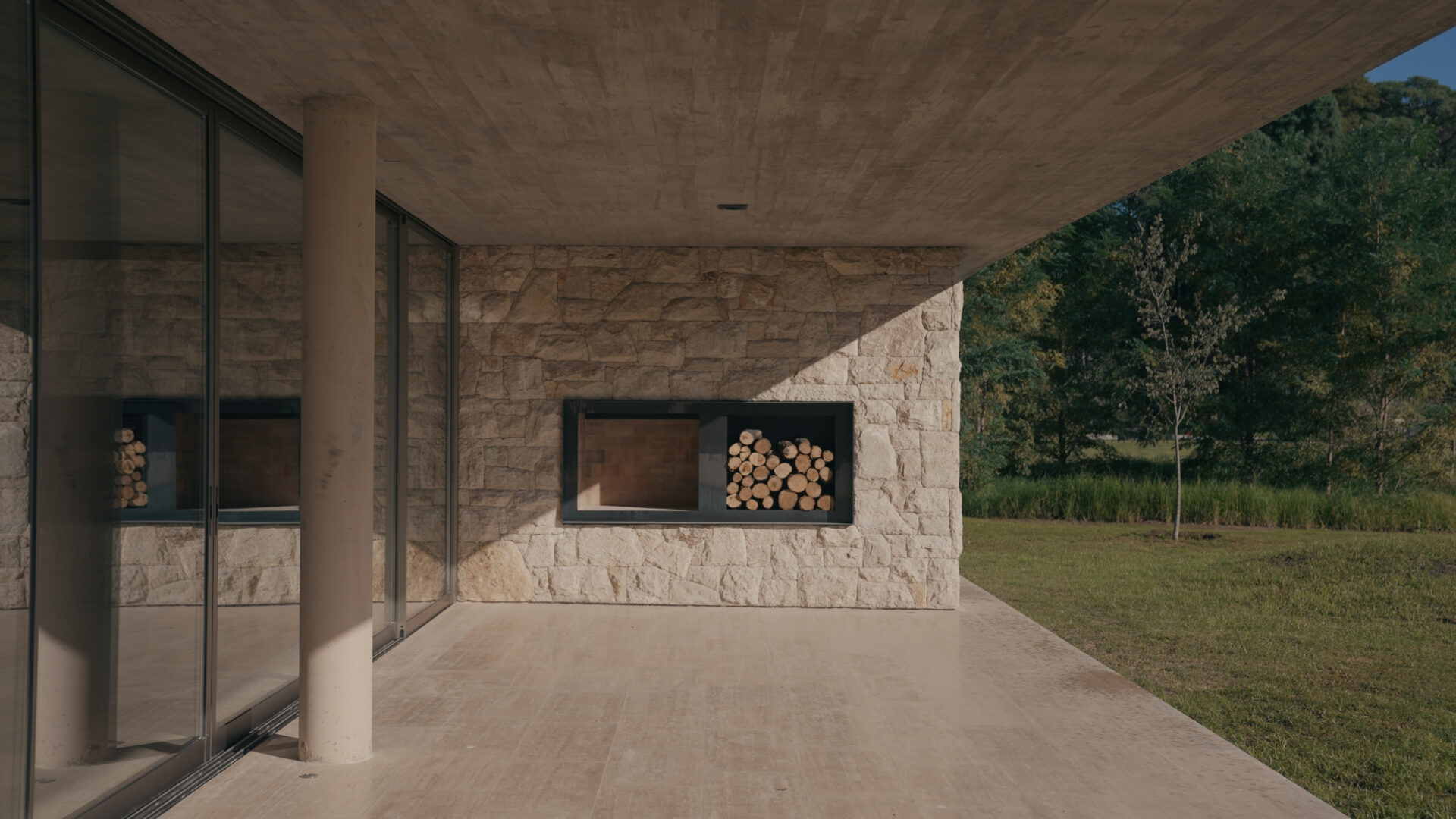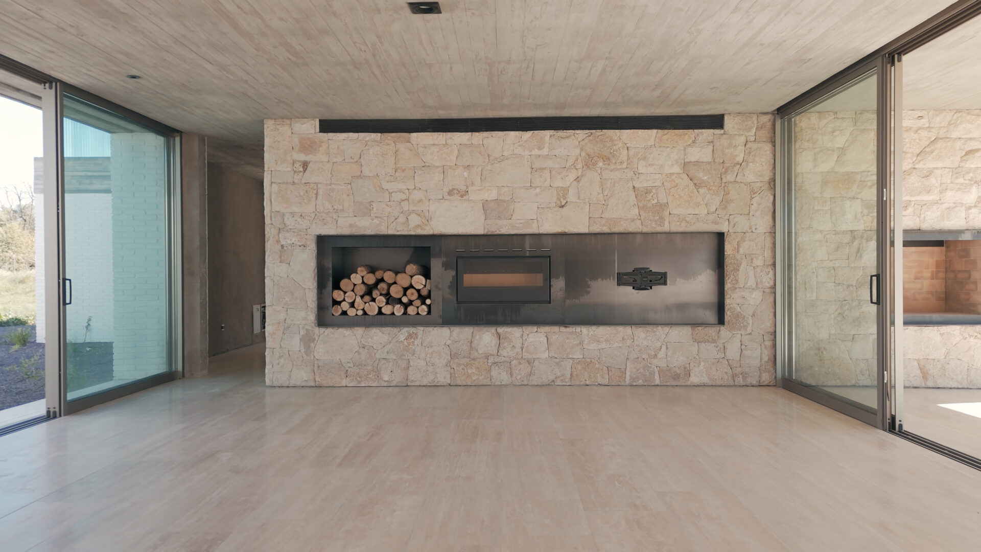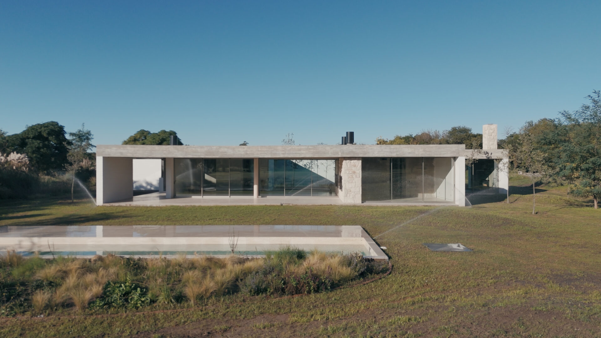 The service area consists of a laundry room, a room with a bathroom, a clothes rack and storage space.Exposed concrete ceilings shape elegant spaces finished with white brick. Travertine floors are arranged between the fire (with the presence of stokers and fireplaces) on Ascochinga stone walls next to the landscaping inspired by the hills of the golf course. Thus, the subtle relationship between various green areas and private areas, distinguishes the project and gives it a refined character.