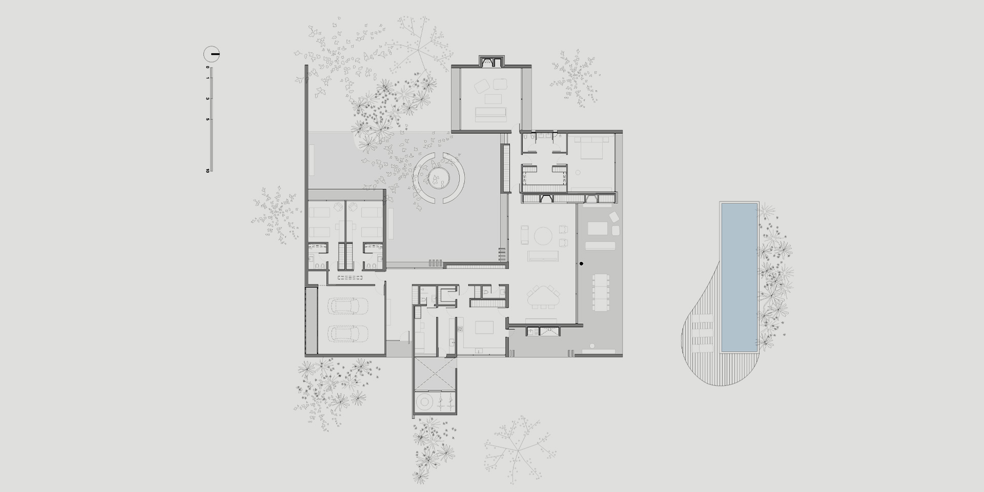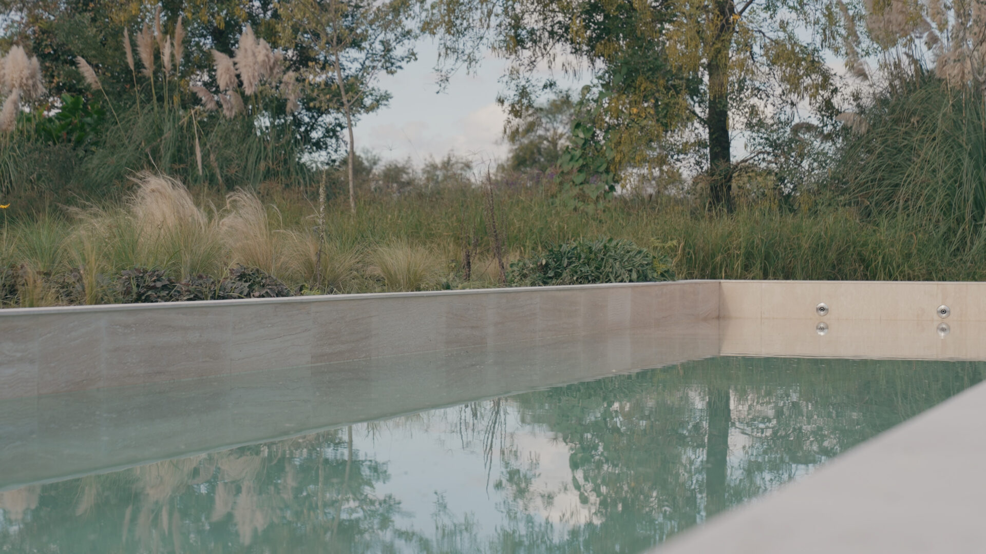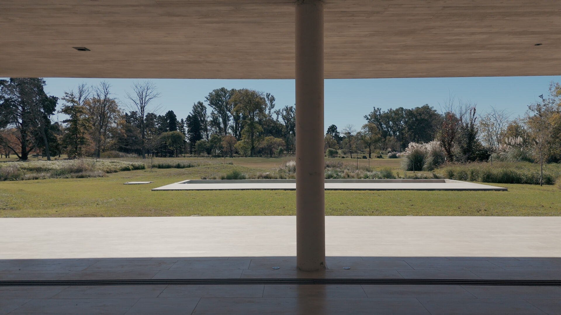 Its trapezoidal shape, open to the north, guides the gaze both towards the golf course and towards the vegetation that surrounds it. Centuries-old trees border the perimeter and make up part of the landscape together with the lagoon.