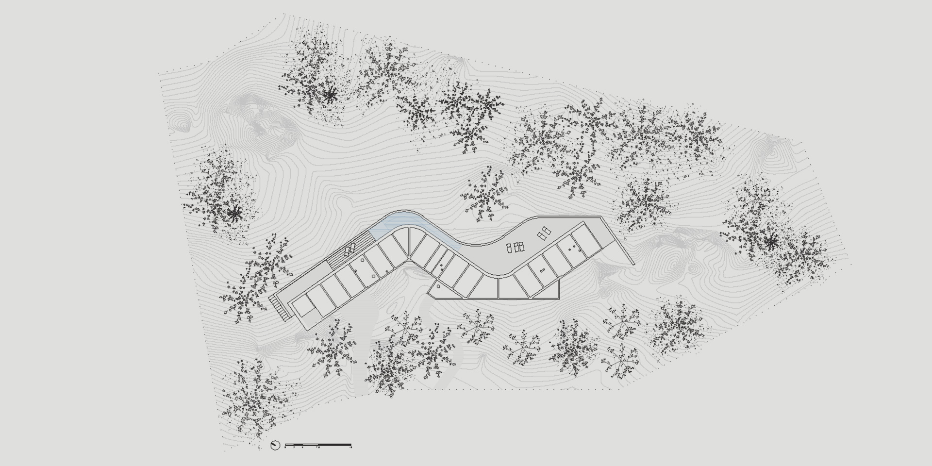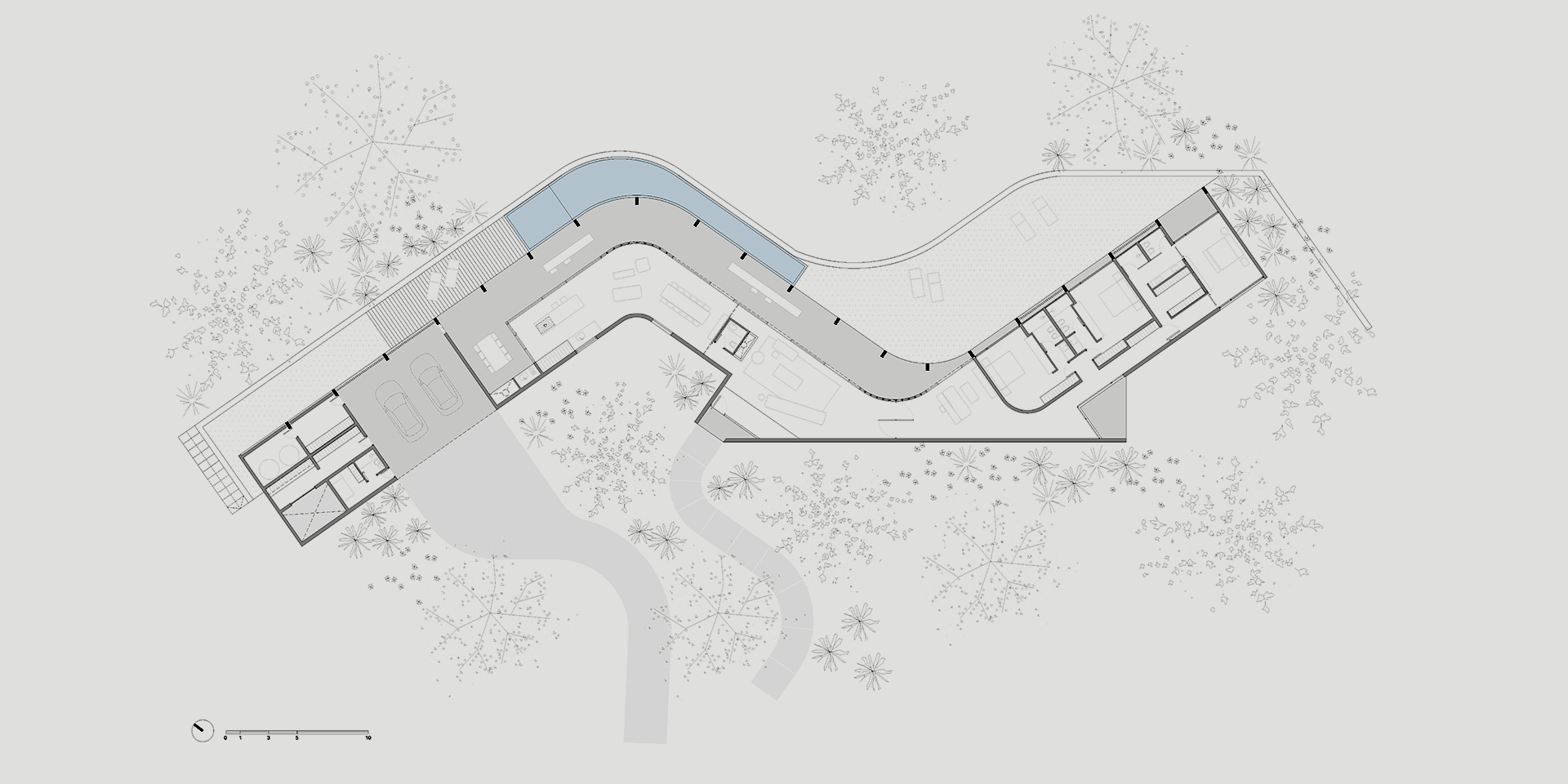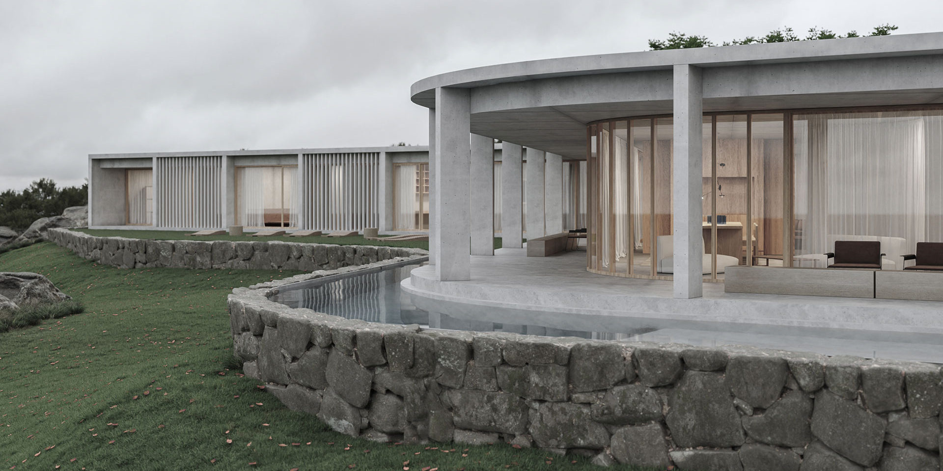 The pool sector and the solarium are presented as extensions of the curve of the gallery. The curved pool, similar to a pond, has a domestic scale and It’s part of the perimeter plinth of the house. It’s completely covered in stone.