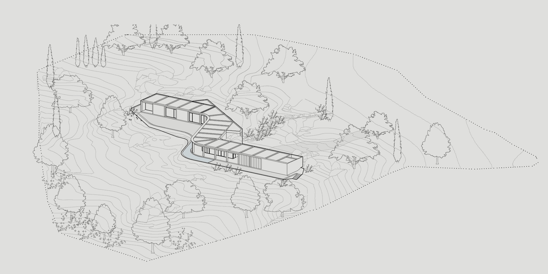 The house is made up of a single floor, which undulates as it settles into the terrain. The volume seems to avoid the pre-existing rockeries while integrating them into the whole. Perched on a seamless stone concrete base, all its functions are organically articulated in a sinuous figure that literally describes the direction of its journey.