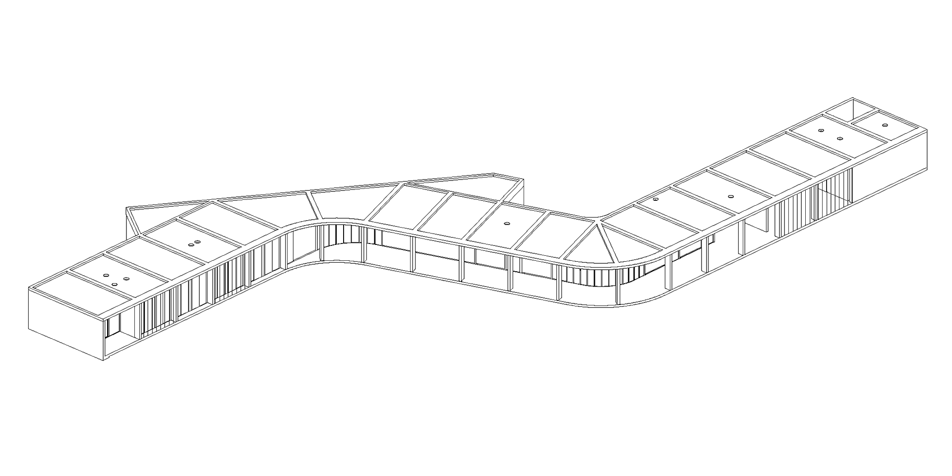 At the other end, the dining room, the kitchen, and the social sector with the grill follow each other spatially. The continuity of the environments is protected by a gallery (extension of the volume slab) that offers a pleasant shade as a space for expansion of the entire public area.The repeated modulation of the columns accompanying the curvature creates a rhythm on the exterior façade that unifies the volume and typifies the place.