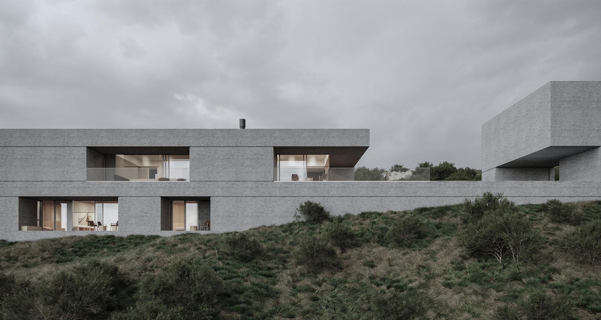 The house is forcefully presented in the lot where it is implanted, and appears solidly against the natural landscape of full contrasts. A monolithic body, covered in gray brick, proposes a link with the contemplative environment.