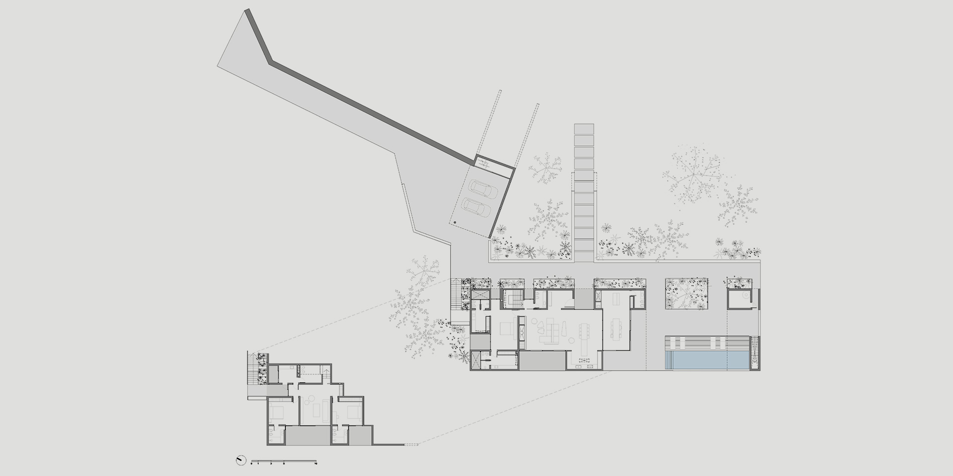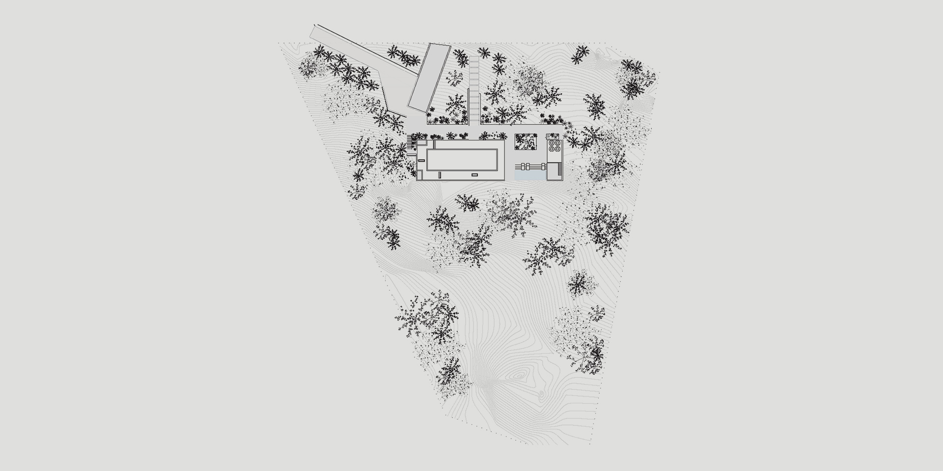 In the social sector, the large living room with integrated kitchen is linked to the barbecue area, which in turn is openly connected to the large terrace with pool. At the other extreme, a tall volume resolves the composition and generates shadow and reflection effects over the water and between the bodies. This space brings together an atelier or office and a bathroom, with marked independence from the rest of the functions of the house. The relationship between the covered and semi-covered spaces and the places with total opening of the sky and the horizon, are articulated in a regular way to characterize the spaces and deliberately frame the landscape.